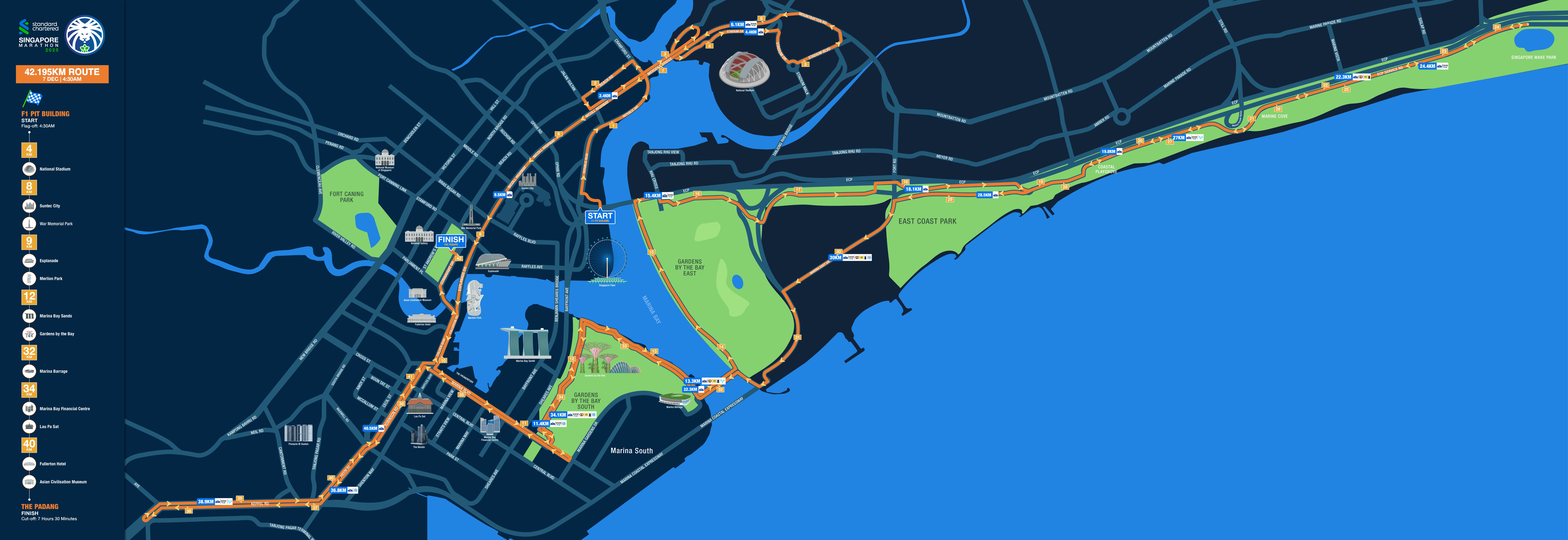 Turning left at Marina Boulevard, they pass the Promontory and Marina Bay Financial Centre before entering Gardens by the Bay. From here, runners proceed through Gardens by the Bay South, cross the Marina Barrage, and then enter Gardens by the Bay East. They will then run along the East Coast Park (ECP) PCN from Rhu Cross continuing eastward towards ECP Service Road for about 5km, they make a U-turn at Laguna Flyover, retrace their route back towards Marina East Drive, cross the Marina Barrage, and return to Gardens by the Bay South.